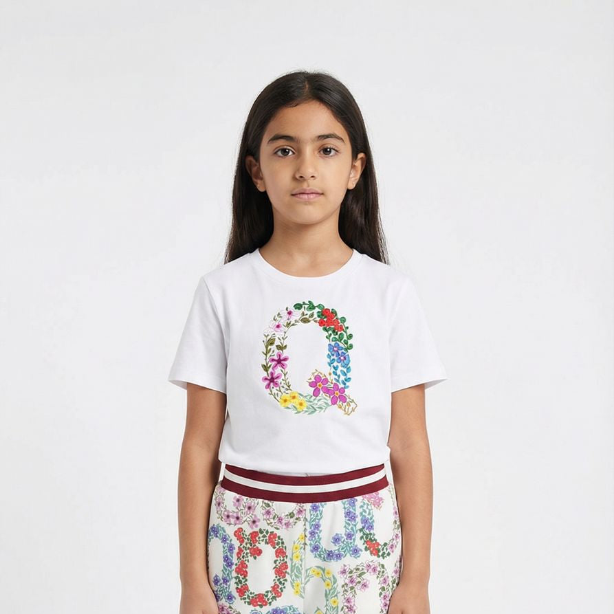 A fresh and modern take on Qatar’s national identity. Our Floral Q Set features a soft white T-shirt with a beautifully embroidered “Q” made of blooming flowers, paired with matching joggers covered in floral “Q” motifs. Designed for comfort and elegance, this set celebrates the beauty of Qatar in a playful, youthful style. Perfect for everyday wear or National Day festivities.