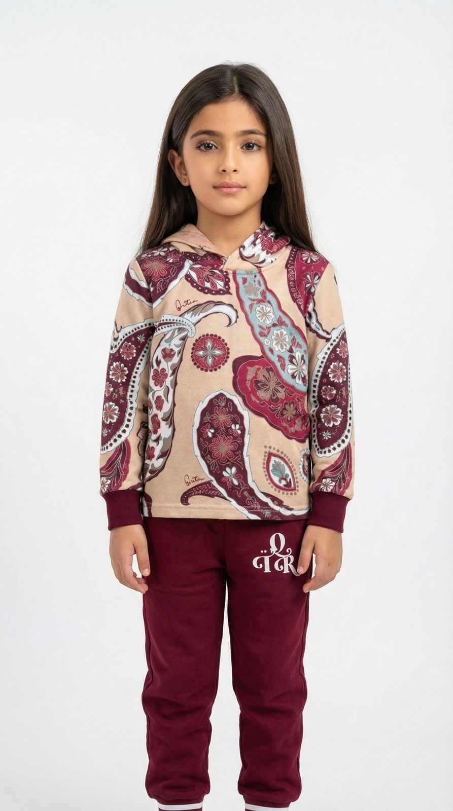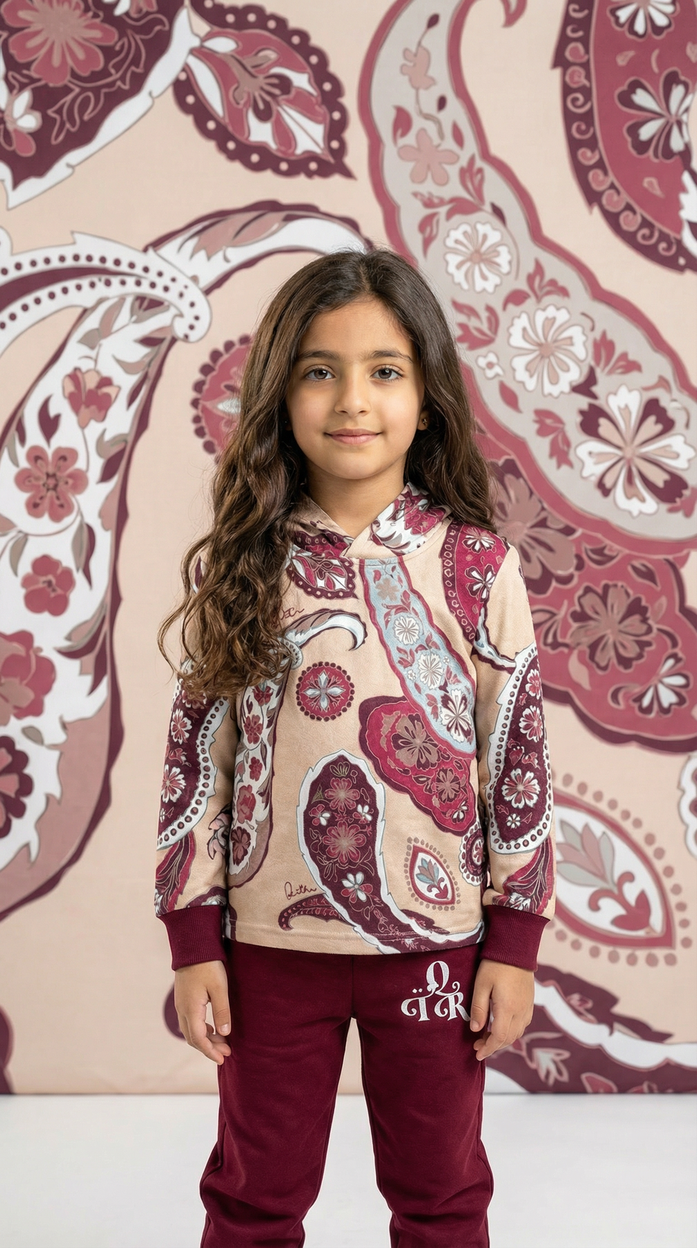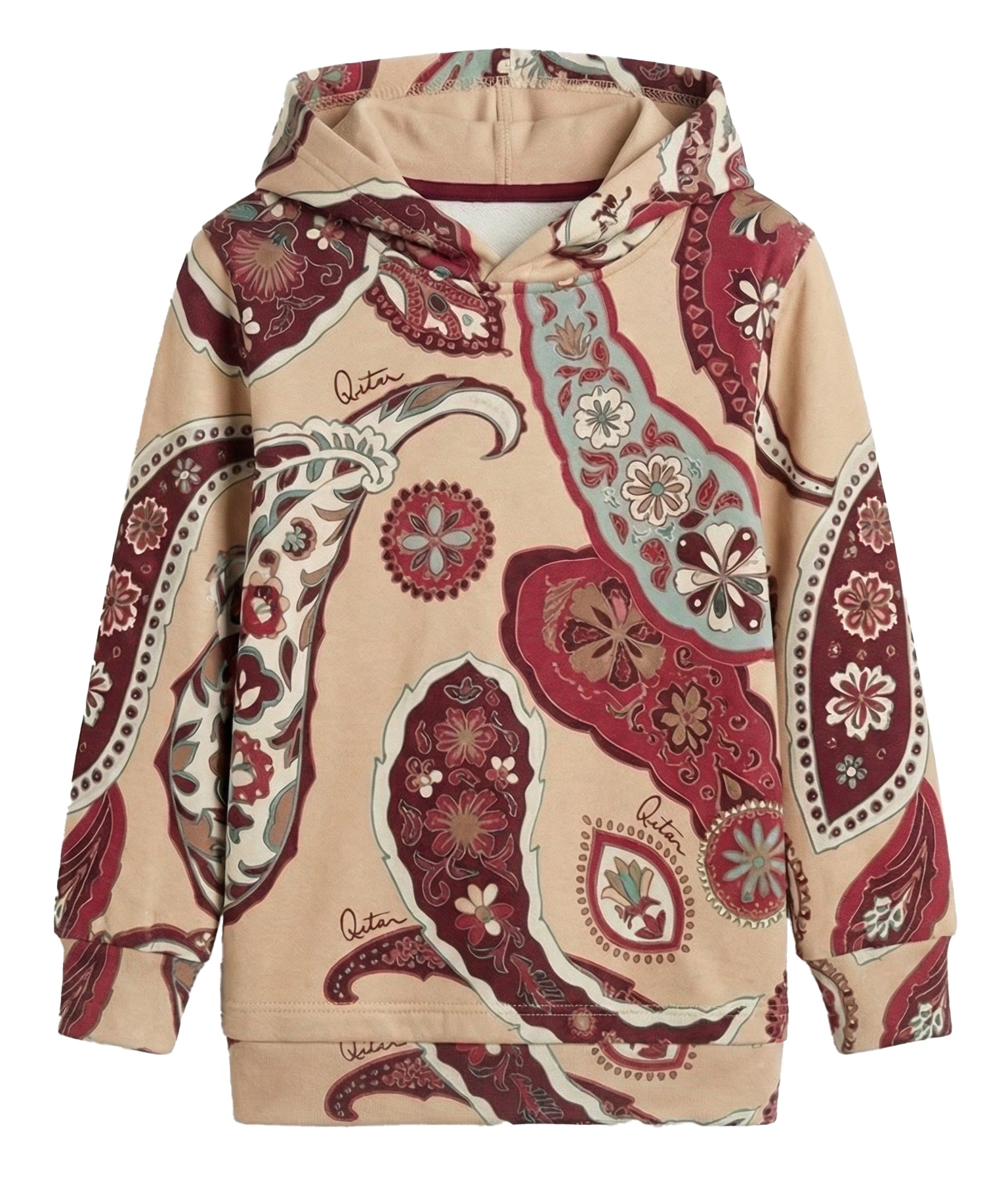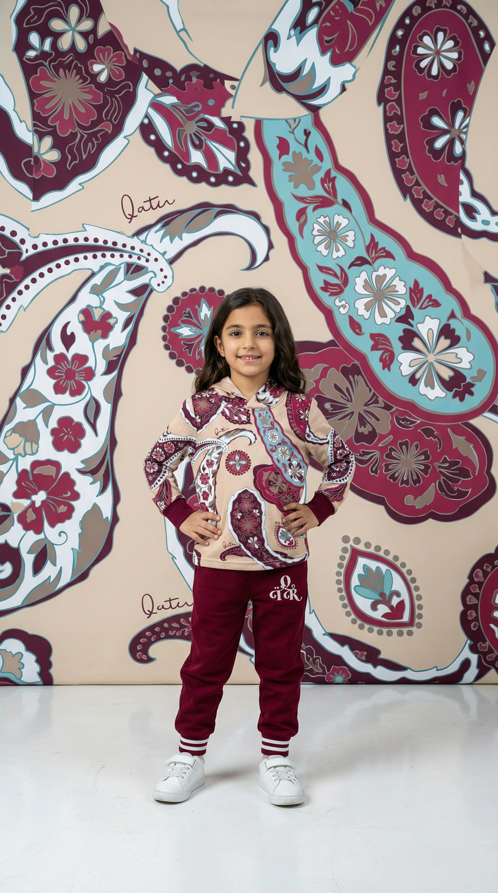 A beautifully crafted hoodie featuring a bold Qatar-inspired paisley print in rich maroon, sand, and soft blue tones. This design blends traditional Middle Eastern patterns with a modern, artistic twist—creating a standout statement piece for kids. Made from soft, comfortable fabric with ribbed cuffs and a lined hood for extra warmth. The intricate paisley motifs are infused with subtle Qatar elements, celebrating culture through color and pattern. Perfect for National Day, special outings, or everyday cozy wear.