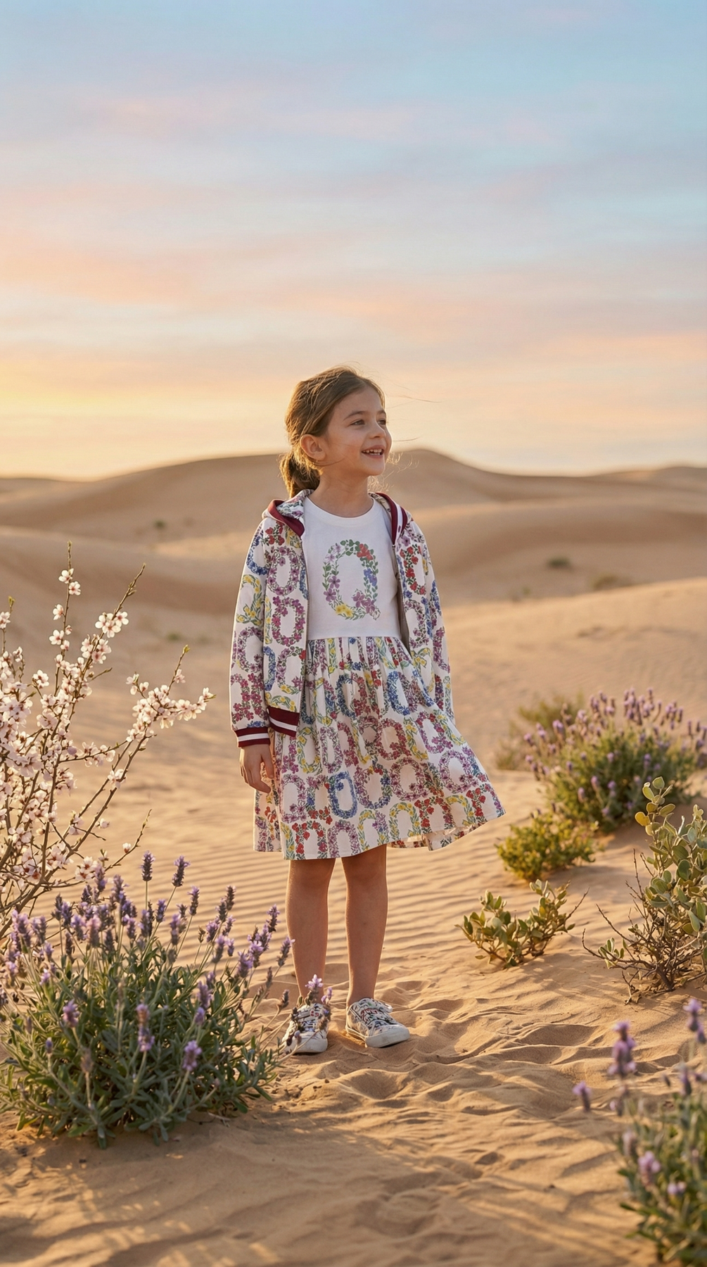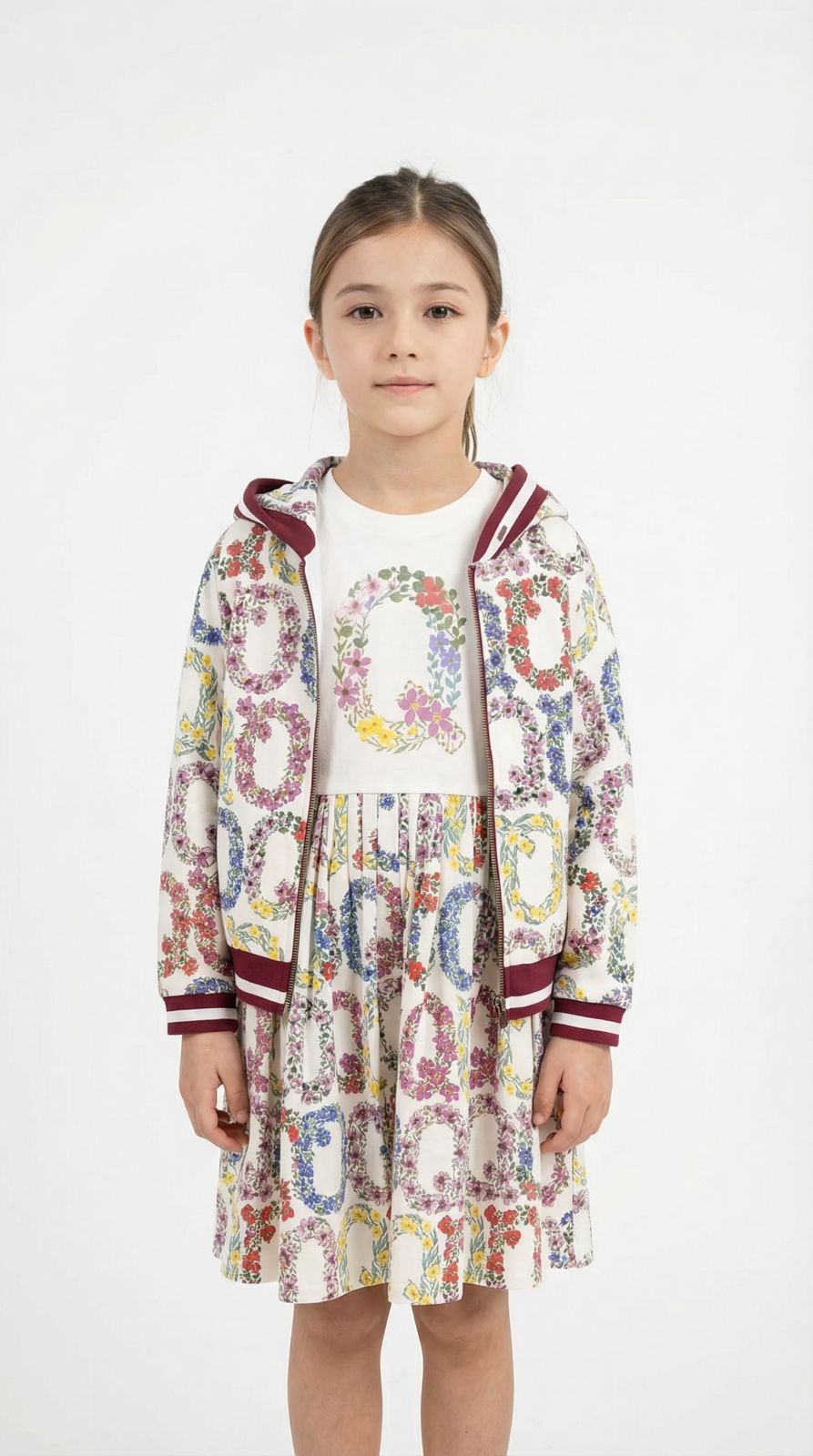 A soft and feminine ensemble crafted for elegance and comfort. Featuring our signature Floral Q motifs across the dress and jacket, this set blends playful charm with beautiful details. Ideal for outings, celebrations, and everyday style.