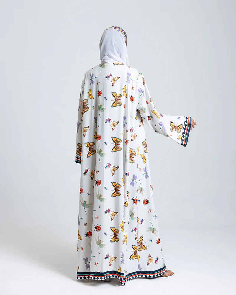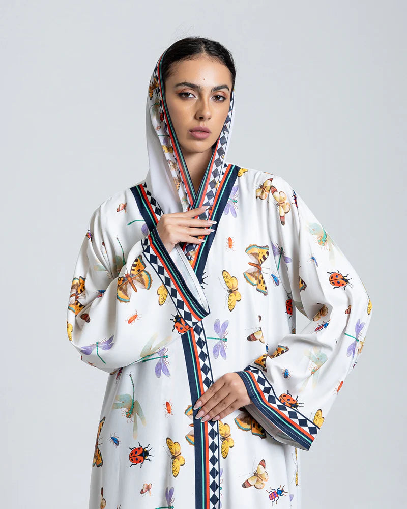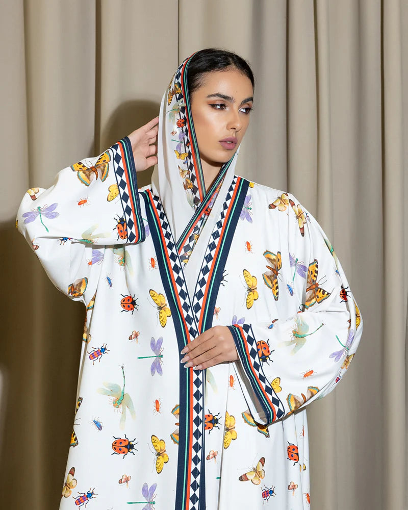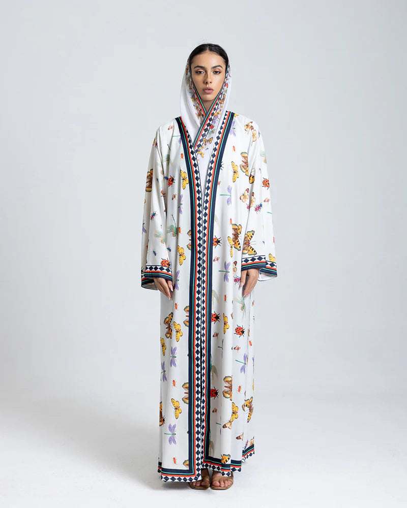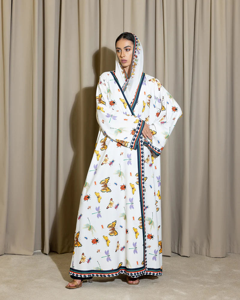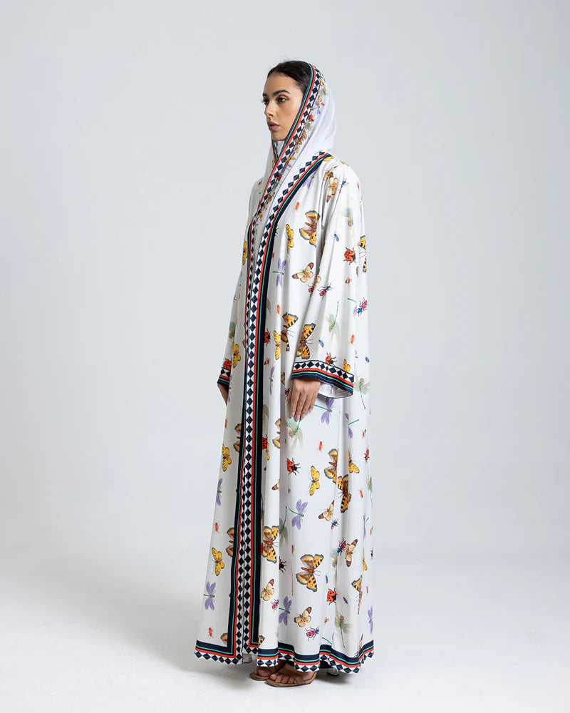 Set against a pure white canvas, the colors flutter with life, creating an enchanting harmony of nature’s tiniest beauties. Every turn makes the artwork dance, giving the abaya a magical flow that feels both youthful and elegant.