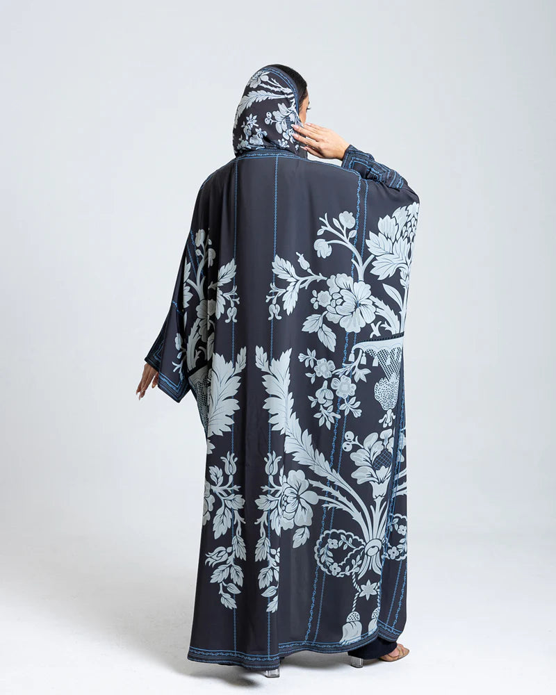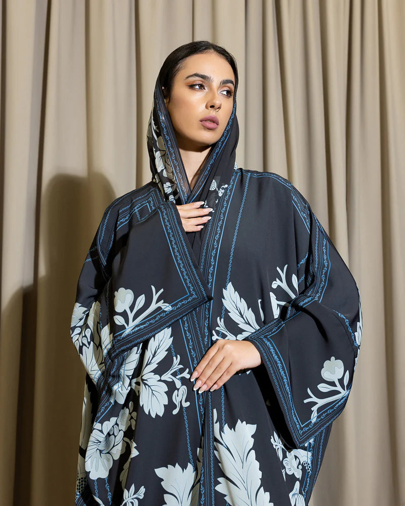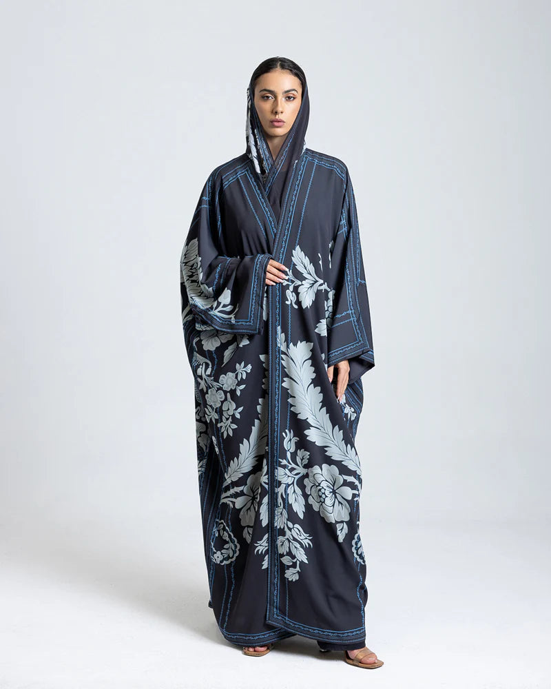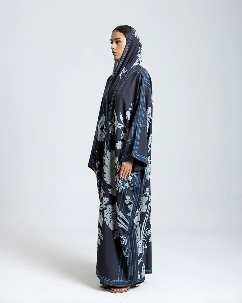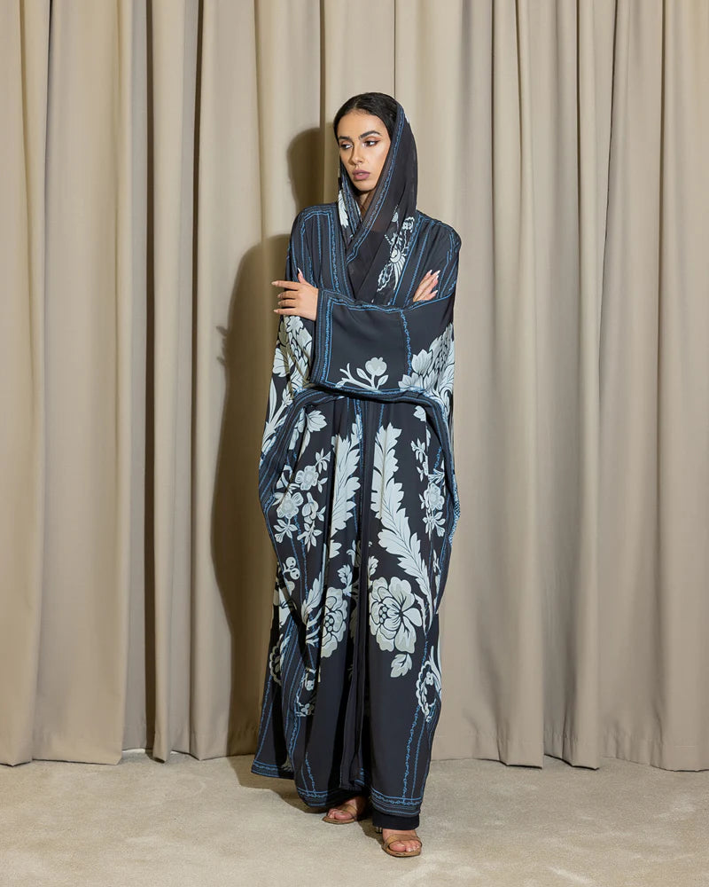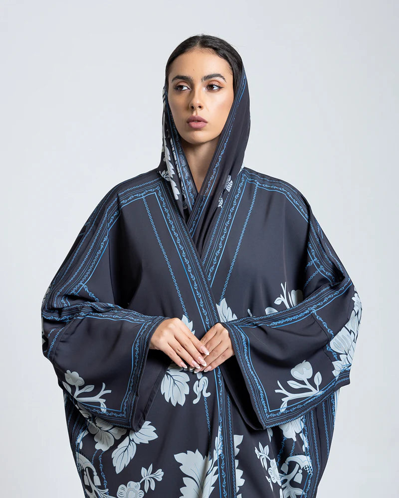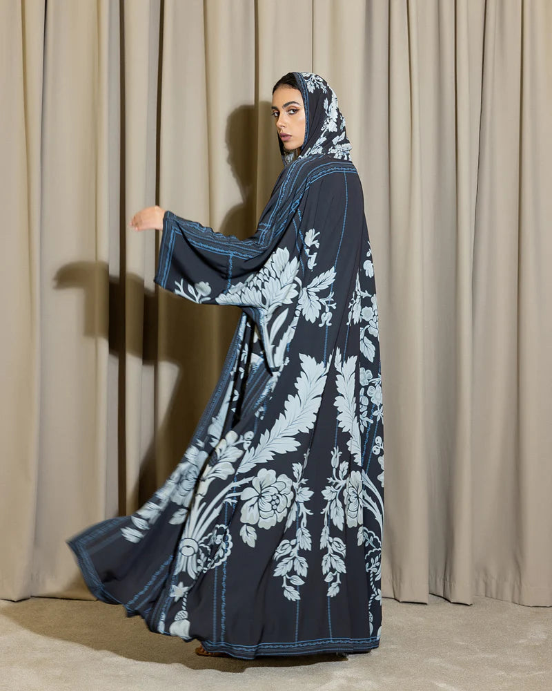 The cool, muted blue tones breathe calm into every detail, creating a look that is both serene and effortlessly sophisticated. Flowing with gentle movement, this abaya feels like a soft night breeze — graceful, refined, and deeply feminine.